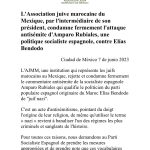 Dans un communiqué rendu public 7 juin, et dont lecollimateur.ma détient copie, l’Association juive marocaine du Mexique (AJMM) condamne fermement le commentaire antisémite de la socialiste Amparo Rubiales. « C’est un acte d’antisémitisme pointant du doigt l’origine de leur religion, de même qu’utiliser le terne « nazi » revient à banaliser l’un des régimes les plus criminels et les plus sanglants de l’Histoire », fustige l’AJMM. « Pour toutes ces raisons, nous demandons au PSOE de prendre les mesures appropriées et de prendre note que ces vocabulaires n’aident pas au respect et à la coexistence dans un pays et dans le monde », conclut le communiqué signé du président de l’Association, Moïse Amselem Elbaz.
