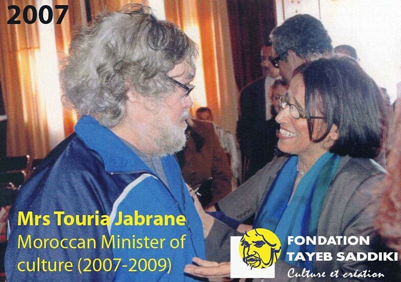 Madame Touria Jabrane, artiste et Ministre de la Culture de l’époque accueillant Tayeb Saddiki lors de la remise des premières cartes d’artistes au Maroc ; dont la carte portant le numéro un lui fut remise.
