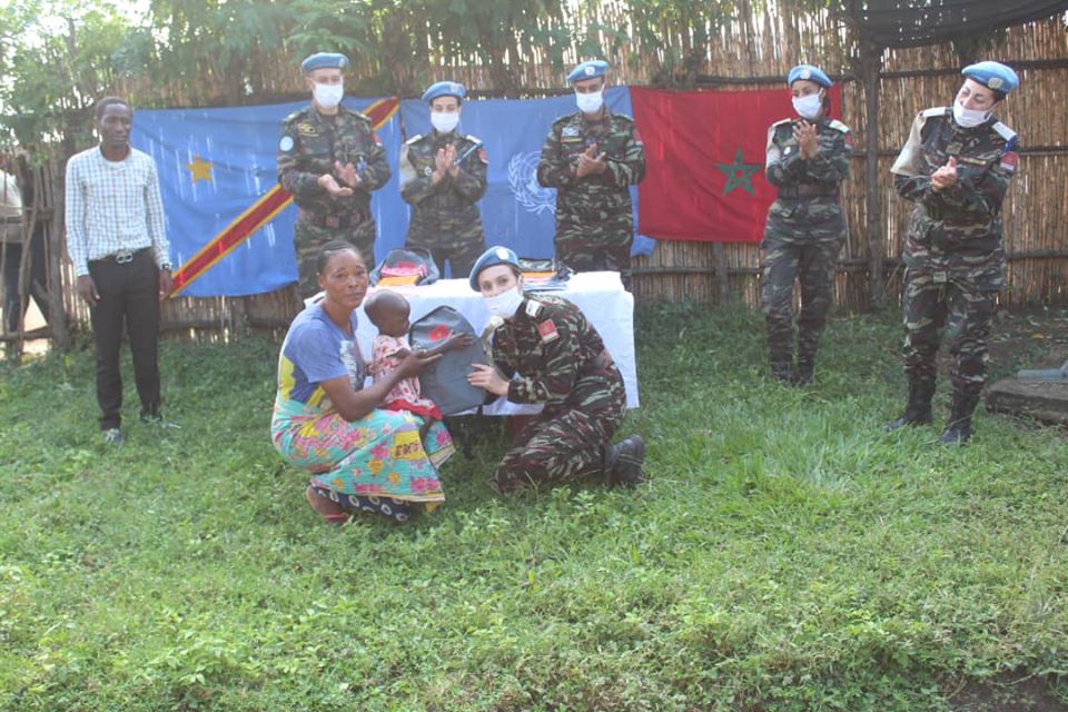 « Le 16 juin 2020, des Casques bleus marocains ont présenté du matériel et fournitures scolaires pour les orphelins de l’association « Mouvement fraternel des plus vulnérables » », rapporte Far-Maroc, site marocain spécialisé dans les questions militaires.