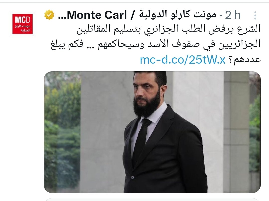 Le 11 février, c’est au tour de la radio publique française, Monte Carlo Doualiya, de certifier en précisant, via son site en ligne, que les soldats algériens et « polisariens » dépêchés en Syrie avaient été arrêtés fin novembre dans les environs d’Alep, alors tout juste tombée aux mains des combattants de « Hayat Tahrir al-Cham » (HTC), dirigée par Ahmed al-Charaa, de son nom de guerre Abou Mohammed al-Joulani.