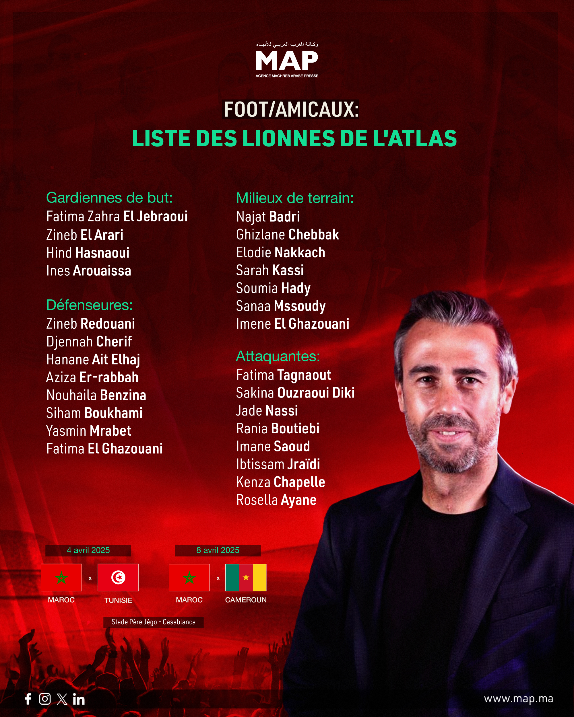 Au cours de ce stage, Les Lionnes de l’Atlas disputeront deux matchs amicaux les 4 et 8 Avril, respectivement face à la Tunisie et le Cameroun, au stade Père Jégo de Casablanca.