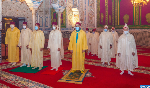 Sa Majesté le Roi Mohammed VI, Amir Al-Mouminine, que Dieu L’assiste, accompagné de SAR le Prince Héritier Moulay El Hassan, de SAR le Prince Moulay Rachid, de SA le Prince Moulay Ahmed et de SA le Prince Moulay Ismaïl, a accompli, lundi, la prière de l’Aïd Al-Fitr béni à la mosquée “Ahl Fès” au Mechouar à Rabat, et reçu les vœux en cette heureuse occasion.