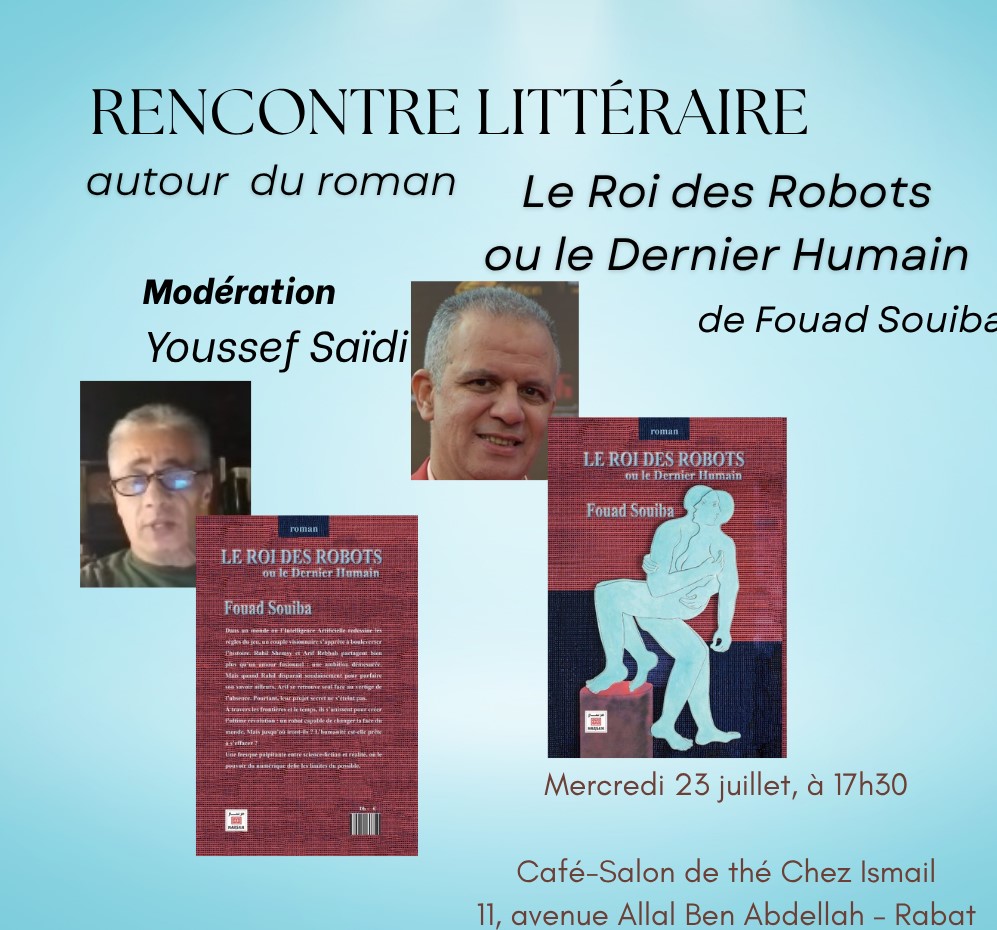 Une rencontre autour du roman « Le Roi des Robots ou le Dernier Humain » de l’écrivain Fouad Souiba est prévue ce mercredi 23 juillet au café – salon de thé « Chez Ismaïl », sis 11, avenue Allal Ben Abdellah, à Rabat.