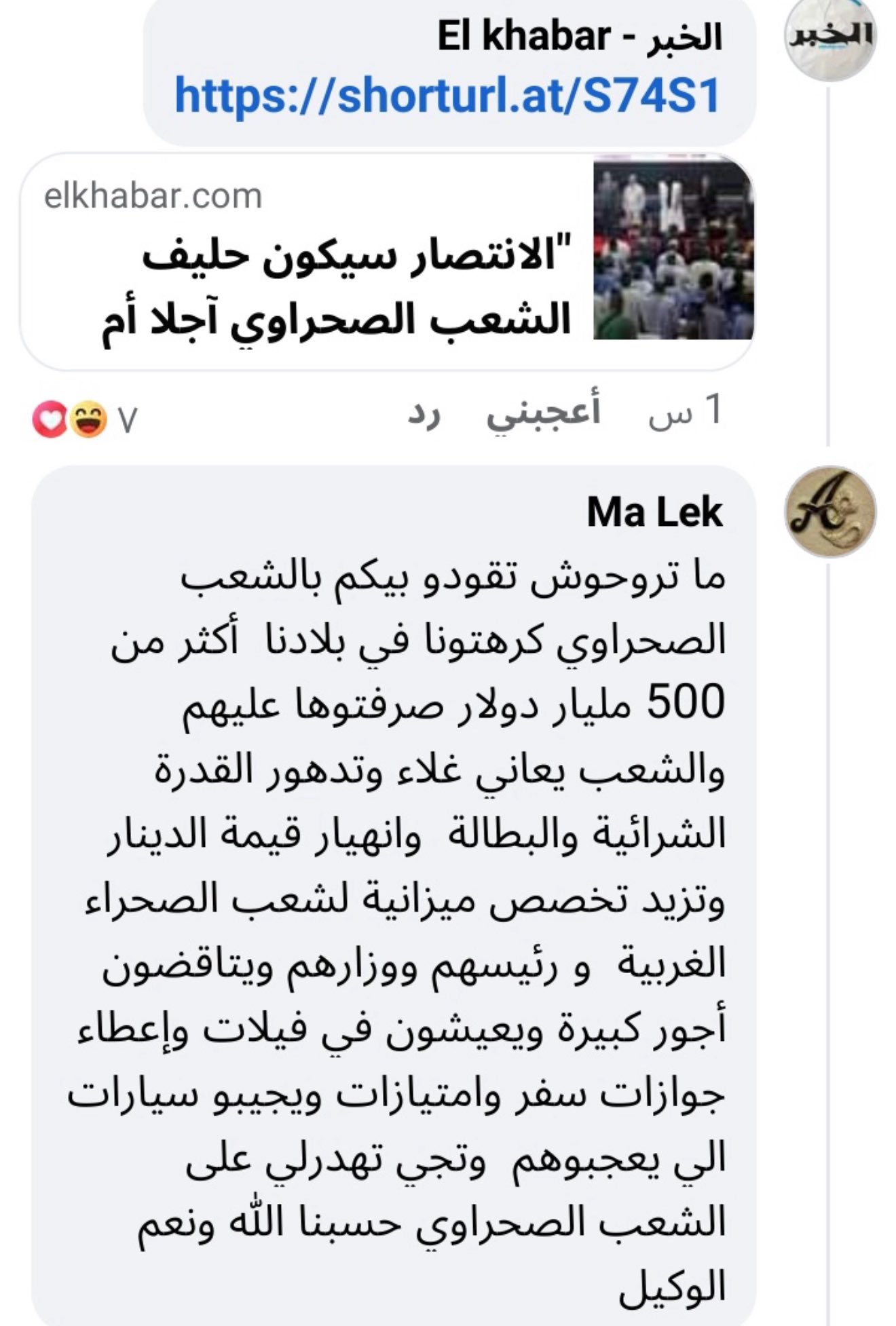 « Arrêtez d’induire le peuple en erreur avec la question sahraouie. Vous avez fini par nous en dégoûter dans notre propre pays. Plus de 500 milliards de dollars ont déjà été engloutis pour eux, alors que les Algériens ordinaires souffrent de la flambée des prix, de l’effondrement du pouvoir d’achat, du chômage et de la chute du dinar. Et pourtant, vous continuez à détourner des budgets au profit du soi-disant peuple sahraoui. Leurs dirigeants et leurs ministres perçoivent des salaires exorbitants, vivent dans des villas luxueuses, disposent de passeports diplomatiques et de privilèges sans fin, et roulent dans les voitures de leur choix. Et dans le même temps, vous osez nous menacer avec le “peuple sahraoui” ? Assez. Dieu nous suffit, Il est le meilleur des juges. »