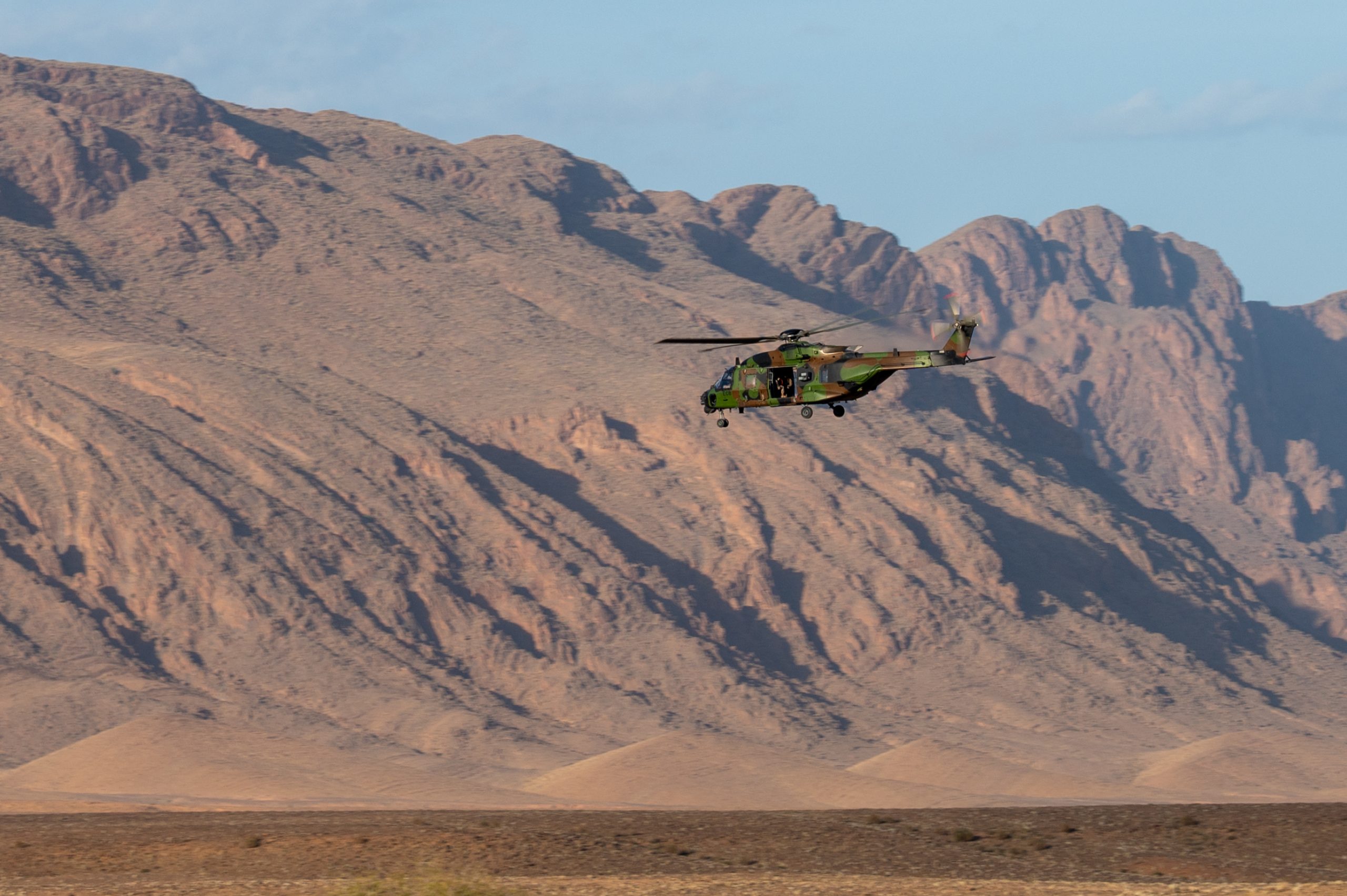 Chars M1A2 Abrams, hélicoptères Gazelle marocains, Tigre et NH90 français sont mobilisés dans un environnement particulièrement réaliste et exigeant de par le relief de l’Atlas, le sable et les écarts thermiques.