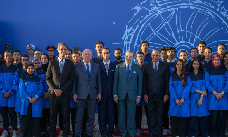 Sa Majesté le Roi Mohammed VI a ensuite posé pour une photo-souvenir avec un groupe de jeunes en cours de formation à l’Institut des Métiers de l’Aéronautique (IMA) à Nouaceur, pour intégrer la future usine de maintenance de moteurs d’avions, avant de procéder au lancement des travaux de construction du Complexe industriel “Moteurs d’avions” du groupe Safran.