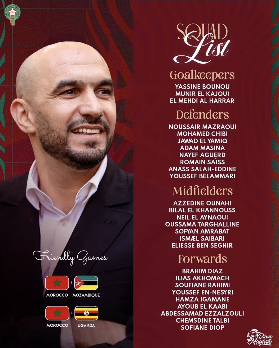 – Attaquants : Brahim Diaz (Real Madrid/Espagne), Chemsddine Talbi (Sunderland/Angleterre), Youssef En-Nesyri (Fenerbache/Turquie), Hamza Igamane (Lille/France), Ayoub El Kaabi (Olympiakos/Grèce), Ilias Akhomach (Villareal/Espagne), Abdessamad Ezzalzouli (Real Betis/Espagne), Sofiane Diop (Nice/France), Soufiane Rahimi (Al Ain FC/Emirats arabes unis).