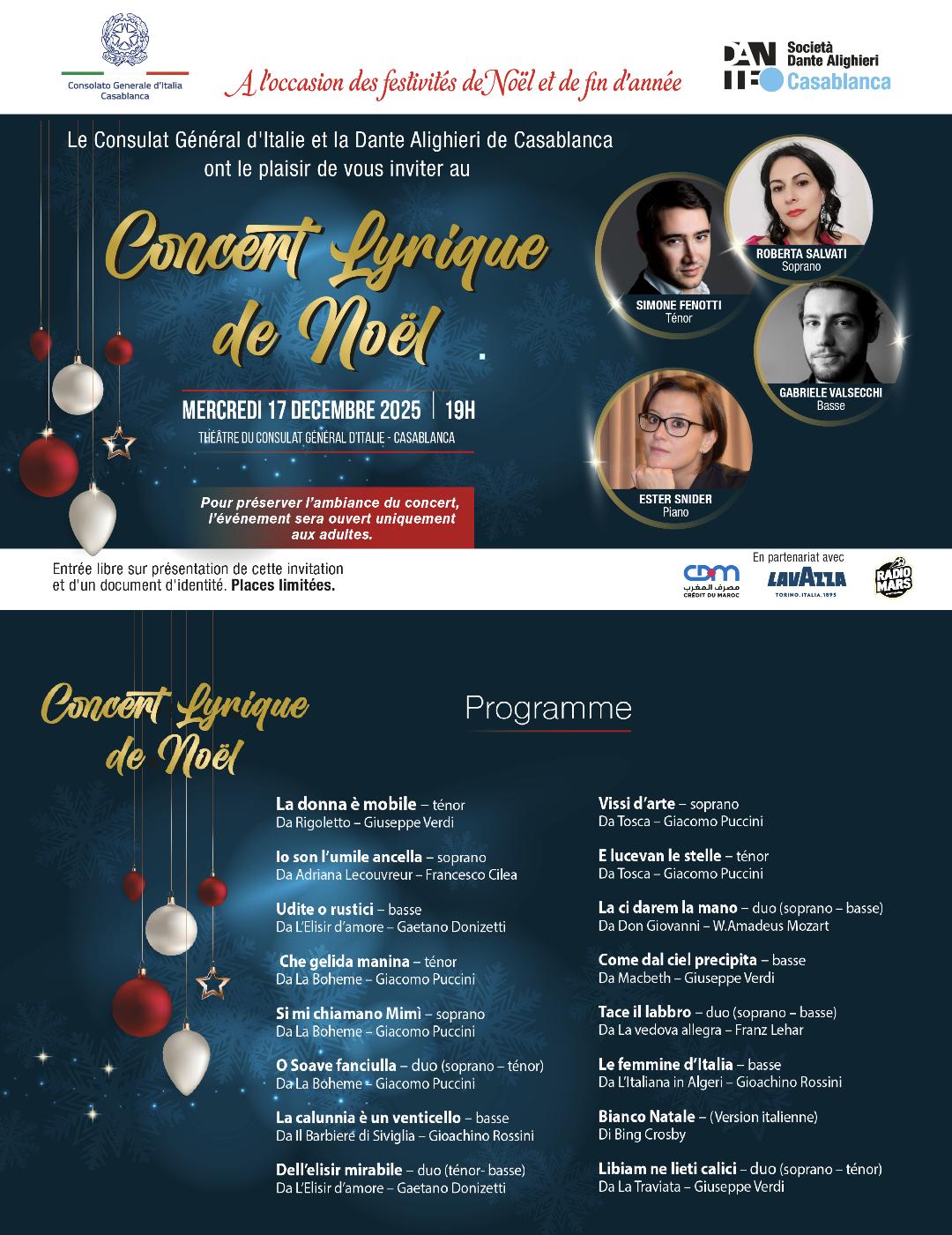 Le Consulat Général d’Italie et la Dante Alighieri de Casablanca donnent rendez-vous mercredi 17 décembre 2025 à 19h, au Théâtre du Consulat Général d’Italie à Casablanca, pour un Concert lyrique de Noël.