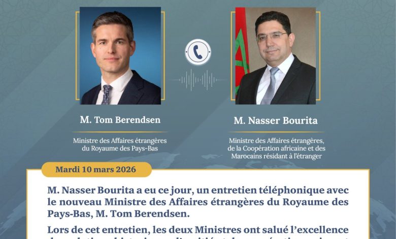 M. Nasser Bourita a eu, ce mardi, un entretien téléphonique avec le nouveau Ministre des Affaires Etrangères du Royaume des Pays-Bas, M. Tom Berendsen. « J’ai eu un entretien téléphonique fructueux avec mon collègue marocain Nasser Bourita. Les Pays-Bas et le Maroc entretiennent des liens historiques de longue date et coopèrent de manière stratégique sur de nombreux sujets. Nous avons réaffirmé notre partenariat et échangé nos points de vue sur la situation au Moyen-Orient« , écrit le nouveau chef de la diplomatie néerlandaise sur son compte « X ».