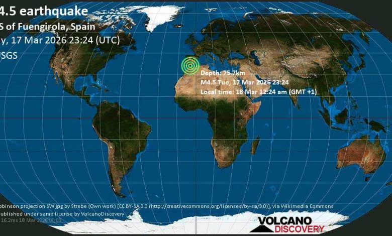 Un séisme modéré de magnitude 3.9 s’est produit sous mer (Mer d’Alboran), comprise entre la péninsule Ibérique au nord, le Maghreb au sud et le détroit de Gibraltar à l’ouest, le mardi 17 mars 2026 à 23:24 GMT, selon les données de la plateforme spécialisée Volcano Discovery.