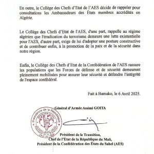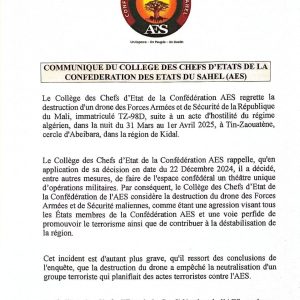 في بيانٍ قُرئ مساء يوم الأحد 6 أبريل 2025 على القناة الأولى لهيئة الإذاعة والتلفزيون المالي، على لسان وزير الأمن والحماية المدنية، الفريق أول داوود علي محمدين، أعرب مجلس رؤساء دول اتحاد “تحالف دول الساحل” عن أسفه لتدمير طائرة بدون طيار تابعة للقوات المسلحة والأمن لجمهورية مالي من طرف الجزائر.