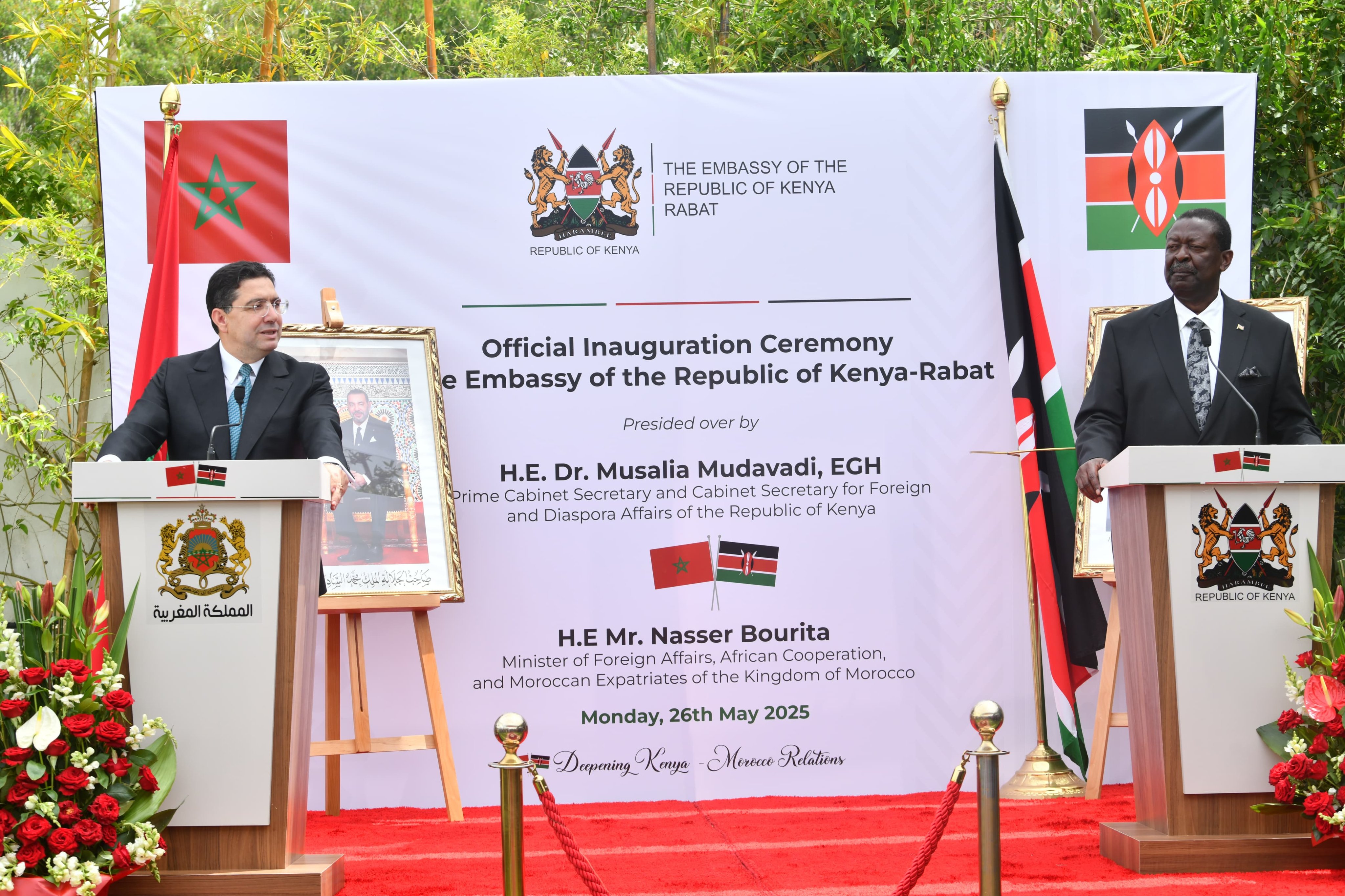 أشرف وزير الشؤون الخارجية والتعاون الإفريقي والمغاربة المقيمين بالخارج، ناصر بوريطة، والوزير الأول، وزير الشؤون الخارجية والمغتربين بجمهورية كينيا، موساليا مودافادي، اليوم الإثنين، على تدشين سفارة جمهورية كينيا بالرباط.