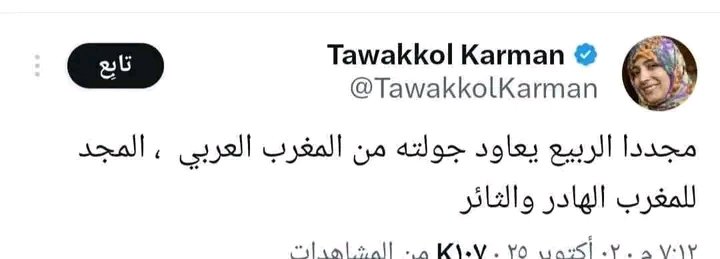 أثارت تدوينة لتوكل كرمان، الناشطة ال”عقوقية” سيئة الذكر، على موقع إكس ٱستنكارا وتنديدا شديدين ليس فقط لدى المغاربة بل حتى لدى مواطنيها اليمنيين أنفسهم. وسبب هذا الإستنكار والتنديد هو محاولة هذه “الأفعى الرقطاء” الركوب على موجة ٱحتجاجات “جيل زد” للتحريض ضد رموزنا الوطنية وعلى رأسها عاهل البلاد حفظه الله ورعاه.