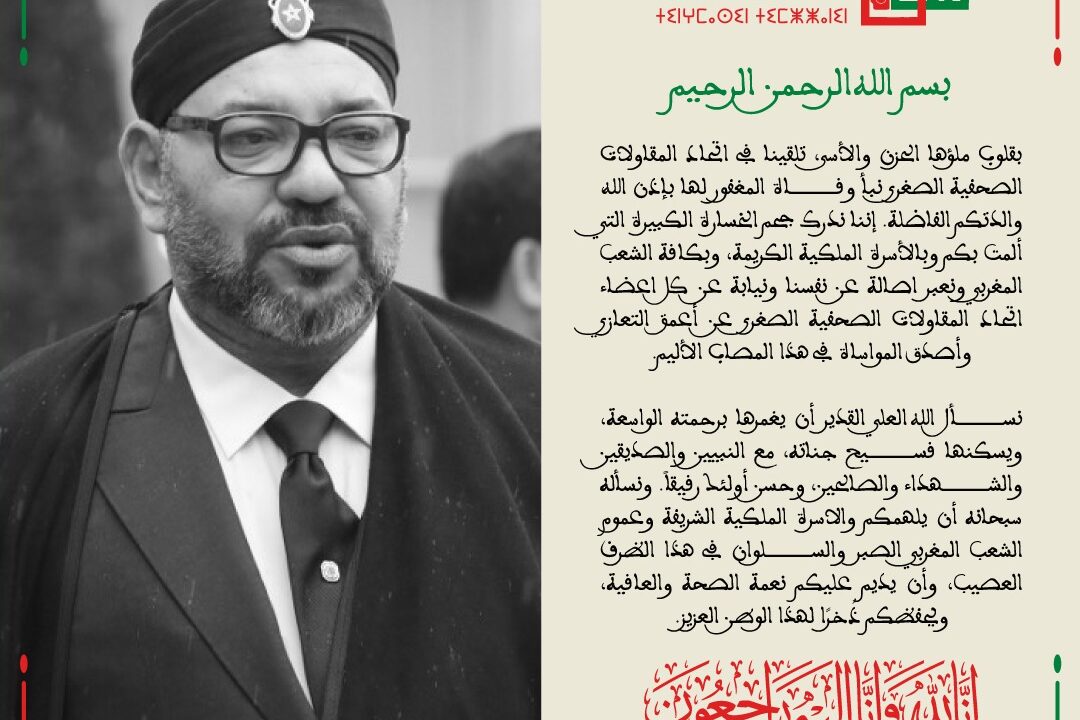 وبهذه الماسبة الأليمة، تتقدم هيئة تحرير جريدة “لو كوليماتور”، وعلى رأسها مدير النشر والتحرير السيد ٱمحمد حمروش، بأسمى عبارات التعازي و المواساة لأبناء الفقيدة, نور الدين، فؤاد، وحيد، نجيب وأنس، سائلين الله عز وجل أن يتغمدها بواسع رحمته وأن يسكنها فسيح جناته ويلهم ذويها جميل الصبر والسلوان.