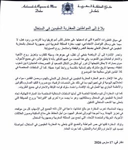 دعت سفارة المملكة المغربية في العاصمة السنغالية دكار أفراد الجالية المغربية المقيمين بالسنغال التحلي بالهدوء واليقظة وروح المسؤولية، وذلك على خلفية المستجدات الأخيرة المرتبطة بنهائي كأس إفريقيا، عقب قرار لجنة الاستئناف التابعة للكونفدرالية الإفريقية لكرة القدم القاضي بسحب اللقب من المنتخب السنغالي ومنحه للمنتخب المغربي، مع اعتبار السنغال منسحبا من المواجهة النهائية.