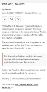 كشفت وكالة رويترز، نقلًا عن مصادر دبلوماسية غربية، أن فرنسا قررت منع طائرات أميركية محمّلة بالأسلحة والمتجهة إلى إسرائيل من عبور مجالها الجوي، في خطوة غير مسبوقة منذ اندلاع الحرب على إيران.